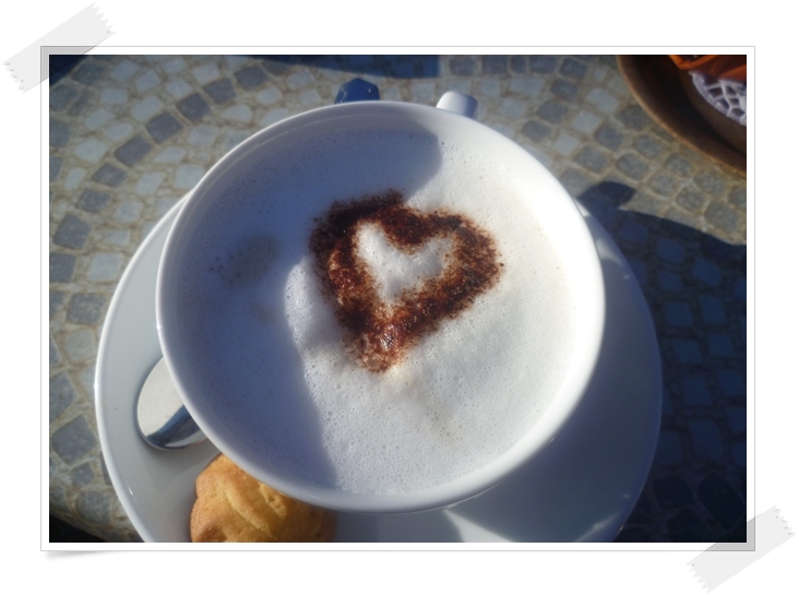 Einen Cappuccino haben wir getrunken und ich liebe es, wenn Herzchen aus Kakaopulver auf dem Schaum sind. Natürlich muss ich das dann auch fotografieren, ist ja klar. Und schöööööön nah ran, Kamera kann das ja.
