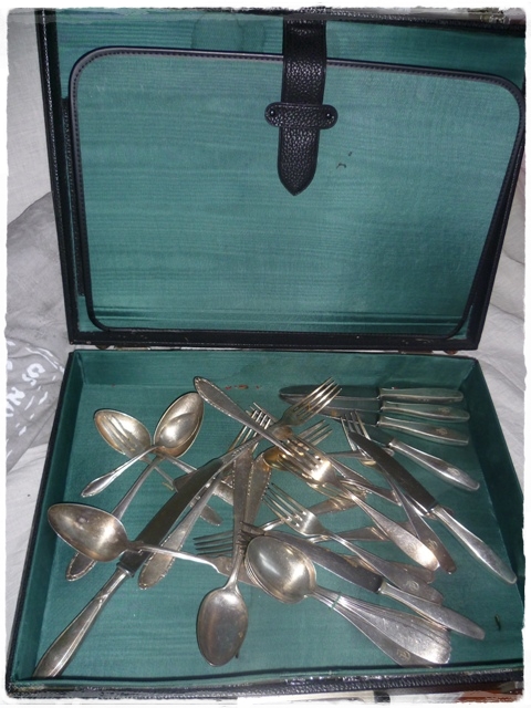 ....uraltes Silberbesteck! Ist es nicht toll? Ich bin ganz aufgeregt, ich freu mich riiiiiiiiiiiesig! Ein Bestecksatz gehörte meiner Großmutter, dies bekam sie von Ihren Eltern als "Aussteuer". Ihre Initialen mit Ihrem Mädchennamen sind drauf, das finde ich einfach wunderbar. Das Besteck ist komplett, jeweils 6 Gabeln, Löffeln, Messer. Die restlichen Teile sind bunt gemischt, aber es ist alles aus Frankreich von unseren "Ahnen" ;)