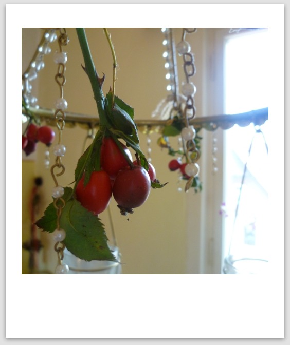 hier seht Ihr meinen Leuchter von Liesb. Dahl, er hängt das ganze Jahr, die weihnachtlichen Dekokugeln habe ich abgenommen. Jetzt hängen Hagebutten (endlich welche gefunden!) dran. Ganz einfach, sieht aber sehr hübsch aus :)